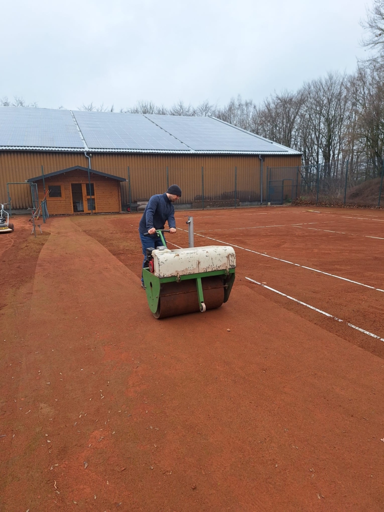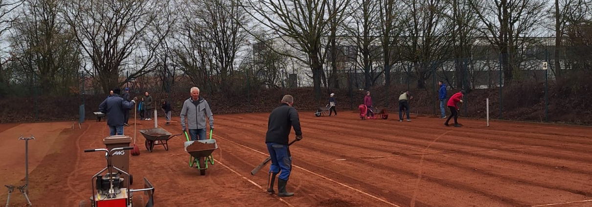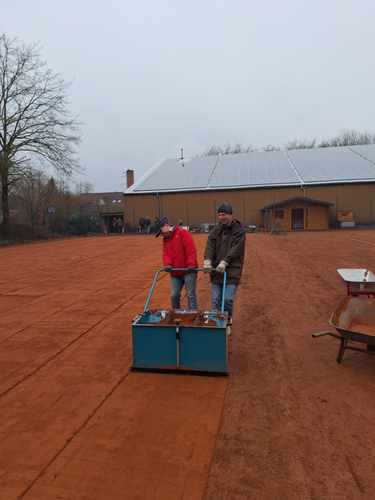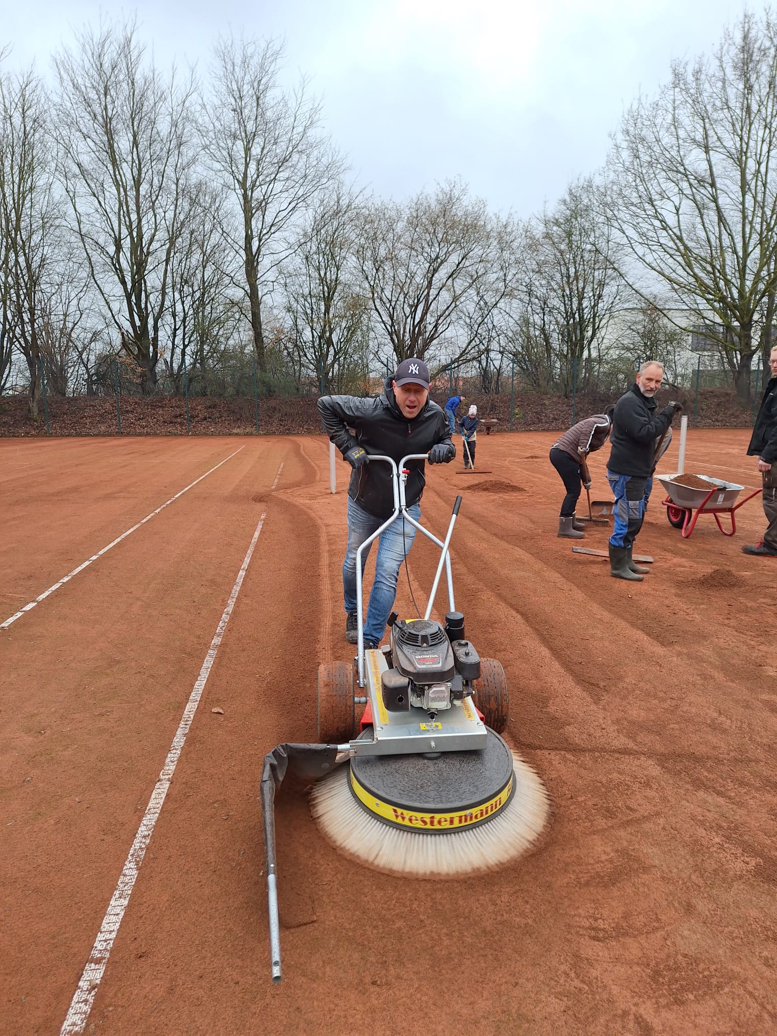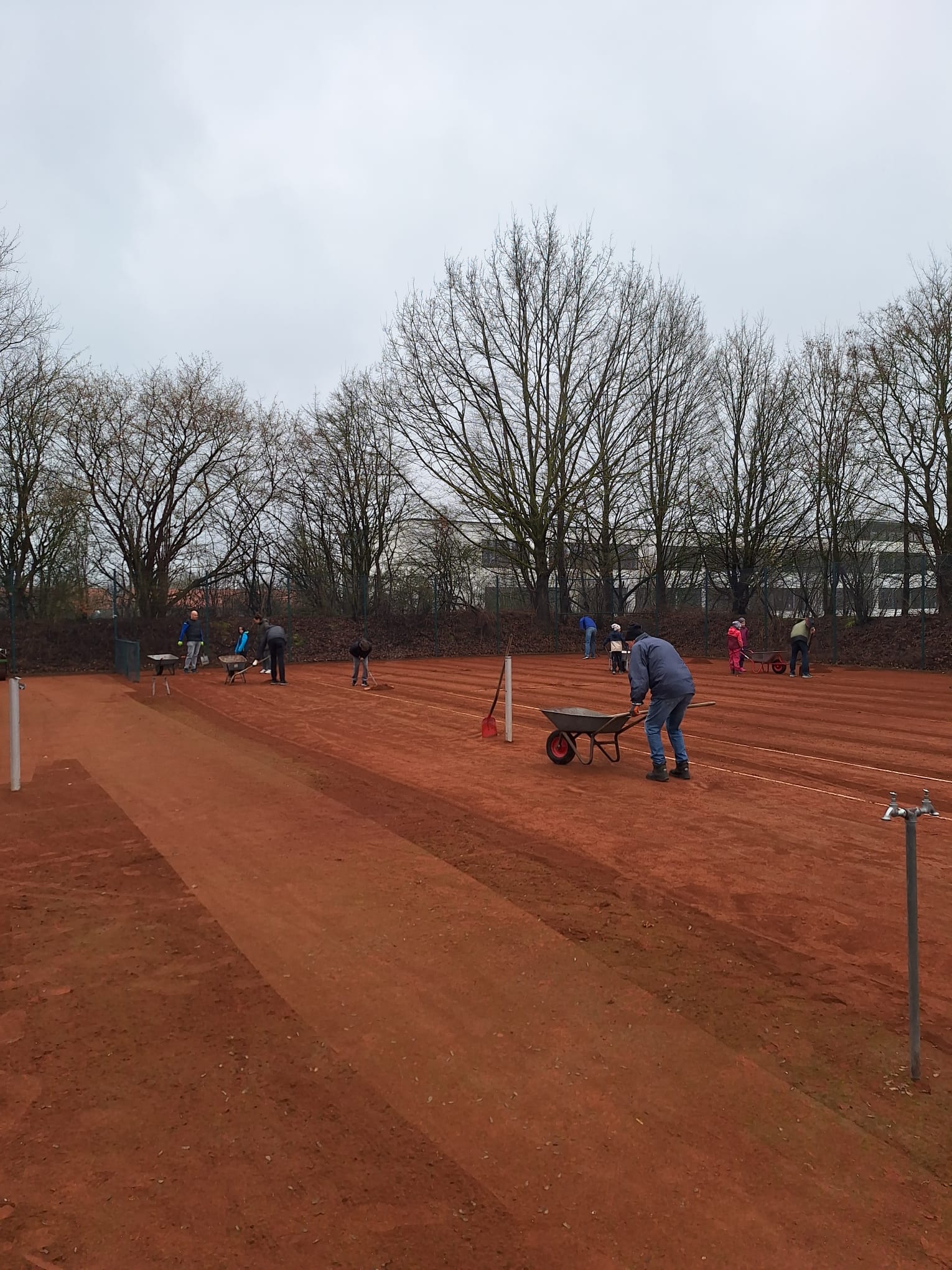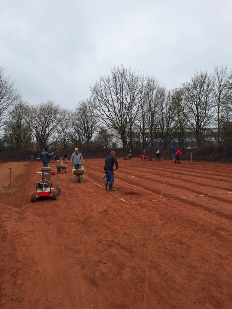 In den vergangenen Jahren wurde die Platzerneuerung von einer externen Firma übernommen. Für dieses Jahr hatte sich der Club vorgenommen, einen Teil der Freiplätze vollständig selbst zu erneuern. Mit Arbeitsgeräten, die der Tennisclub Twistringen dankenswerterweise zur Verfügung gestellt hatte, wurde alter Sand abgetragen und neuer Sand gleichmäßig verteilt. Dank vieler helfender Hände, die den frischen Ziegelmehl herbeischafften und gleichmäßig verteilten, glückte das Experiment. Die Plätze müssen nun einige Tage ruhen, bevor sie gewalzt werden können.