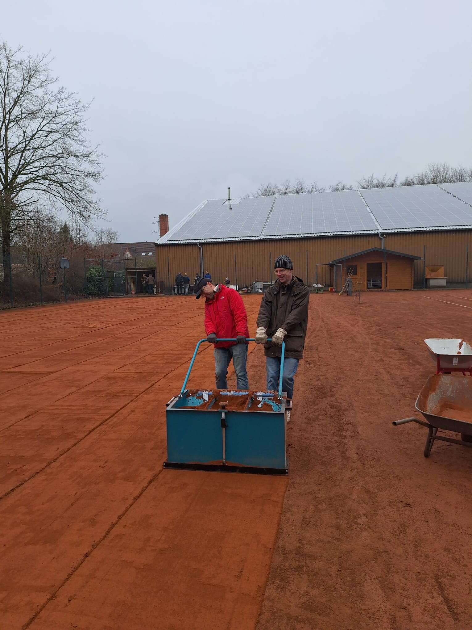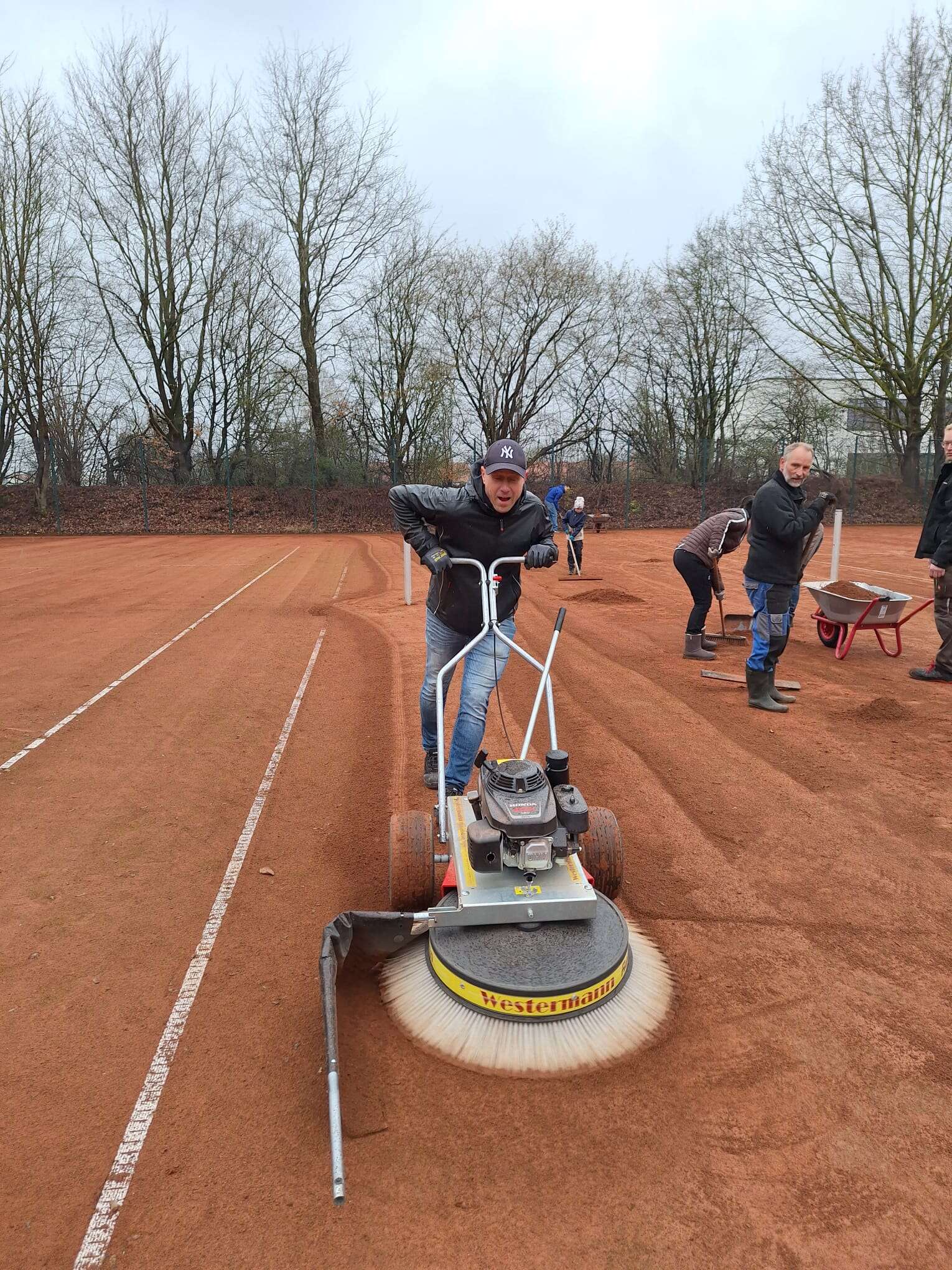 Das Wetter war etwas regnerisch, aber das hat die Mitglieder des TC Bassum e. V. nicht davon abgehalten, in großer Zahl zum Arbeitsdienst zu kommen. Am 13. und 14. März 2026 wurden die Sandplätze für die kommende Sommersaison vorbereitet. Wie üblich wurden die Steine von den Linen genommen, die Windabweiser aufgehängt und die Plätze am Petermoor von jeder Menge Laub befreit.In den vergangenen Jahren wurde die Platzerneuerung von einer externen Firma übernommen. Für dieses Jahr hatte sich der Club vorgenommen, einen Teil der Freiplätze vollständig selbst zu erneuern. Mit Arbeitsgeräten, die der Tennisclub Twistringen dankenswerterweise zur Verfügung gestellt hatte, wurde alter Sand abgetragen und neuer Sand gleichmäßig verteilt. Dank vieler helfender Hände, die den frischen Ziegelmehl herbeischafften und gleichmäßig verteilten, glückte das Experiment. Die Plätze müssen nun einige Tage ruhen, bevor sie gewalzt werden können.Für das leibliche Wohl der arbeitenden Spielerinnen und Spieler wurde gesorgt. Der Grill kam in diesem Jahr erstmalig zum Einsatz.